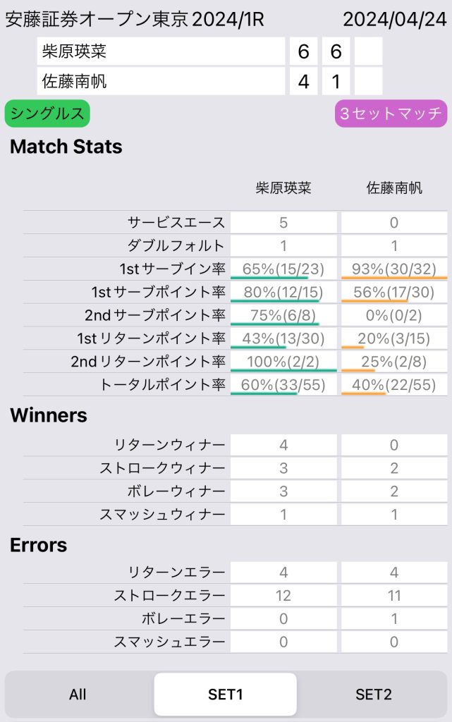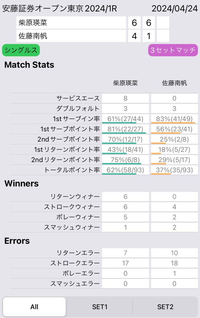 1stセットは両者とも凡ミスありつつも、要所を柴原選手が締めるといった内容。柴原選手は、ファーストサーブでエースが取れたり、サーブで主導権を取れたりと、サービスから展開を作っていた。