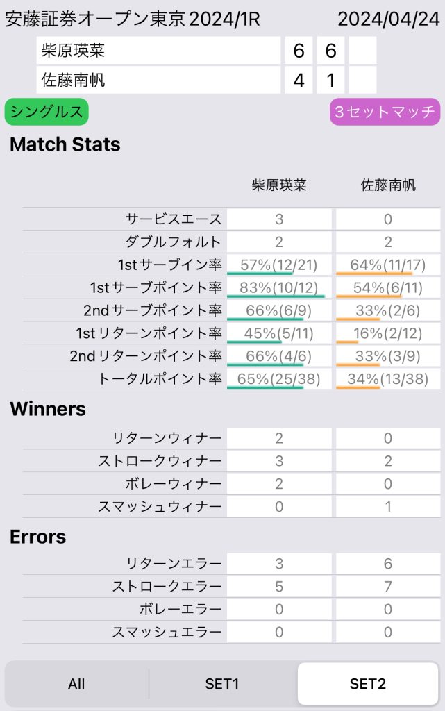 両者のサービス力の差が大きく出た試合となった。スタッツを見ても柴原選手のサービスから、主導権を握っていたかがうかがえる。