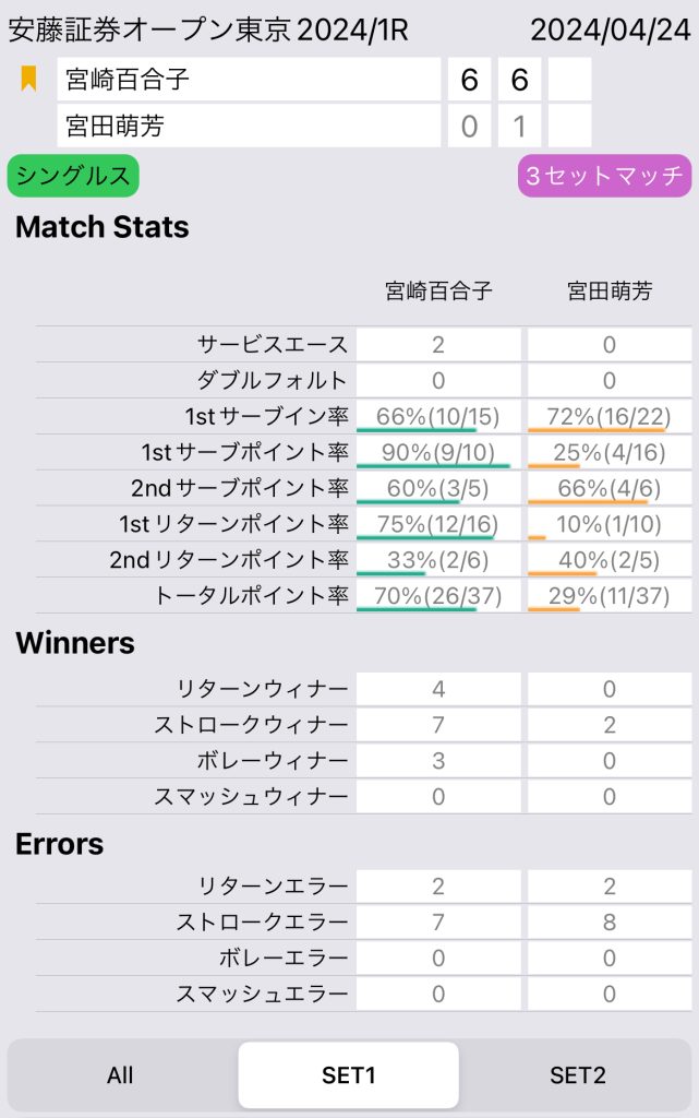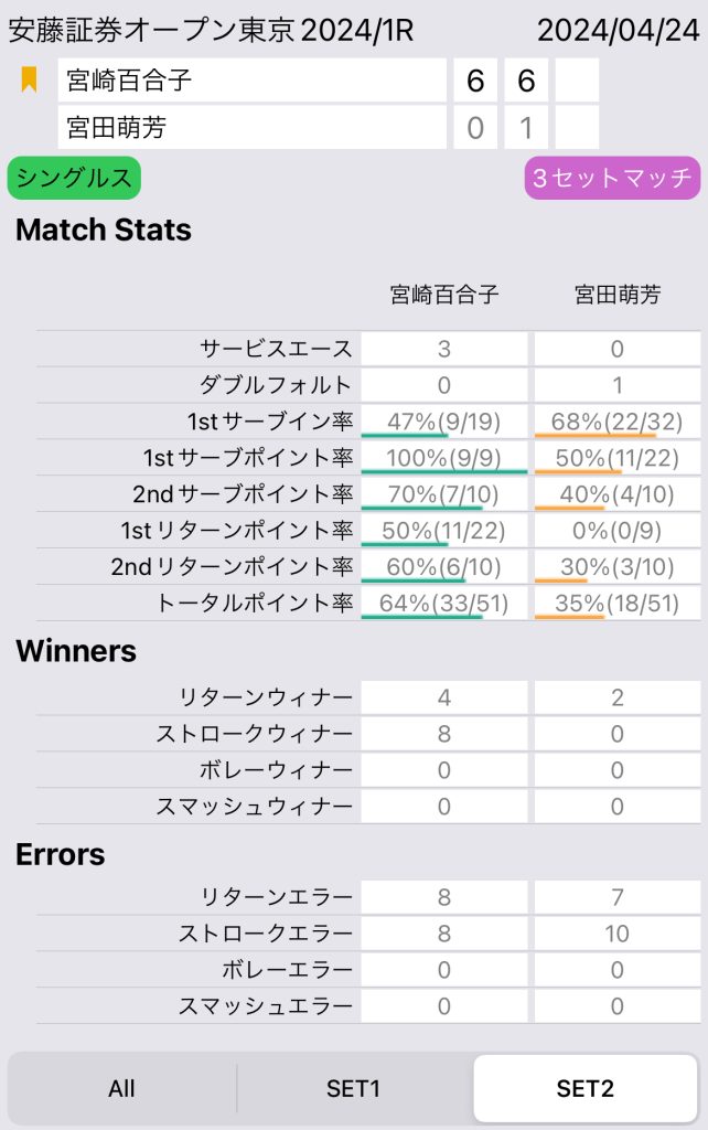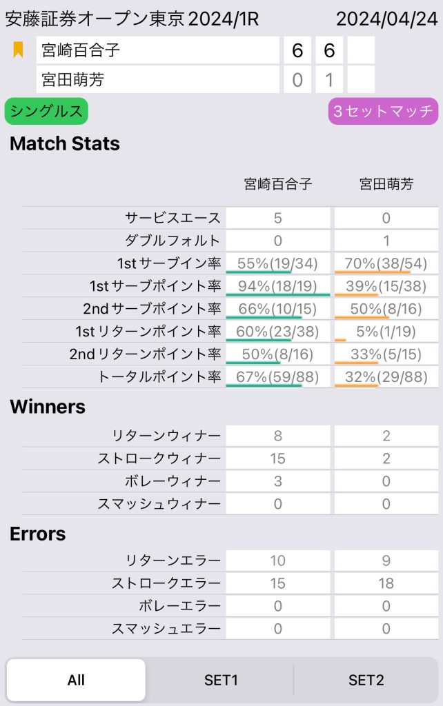 スタッツを見ると、宮崎選手1stサーブポイント率94%、リターンウィナー8本、対して宮田選手は1stサーブポイント率39%、リターンウィナー2本とサーブ力の差が明確となった。