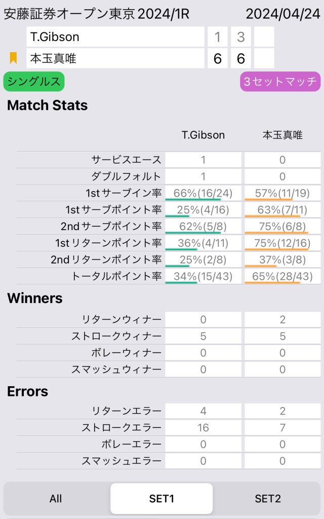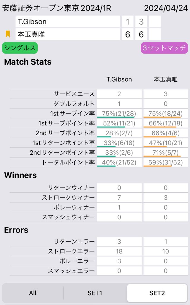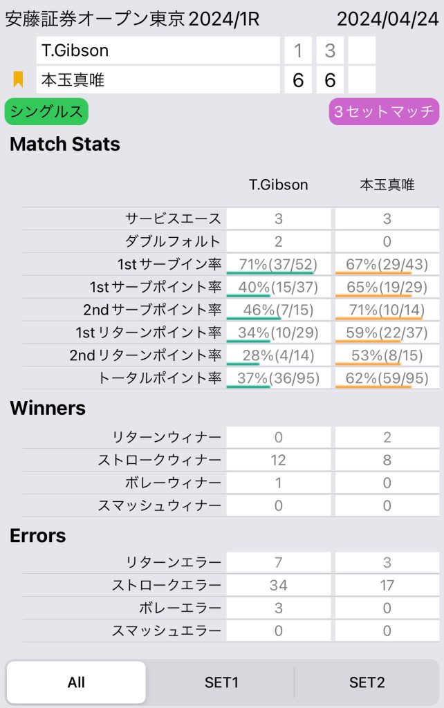 特に素晴らしいのは、相手の1stサーブイン率が71%でも、本玉選手の1stリターンポイント率59%と非常に安定したリターンが出来ている点だ。