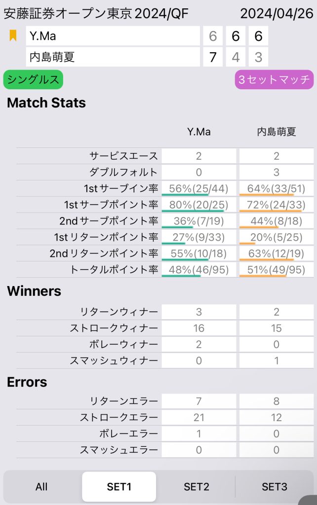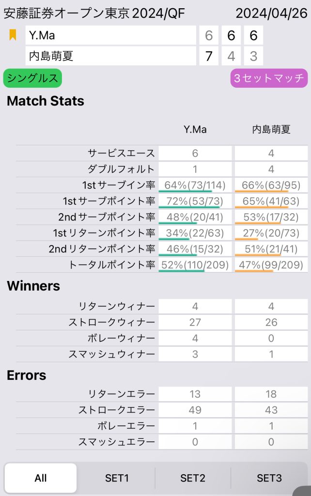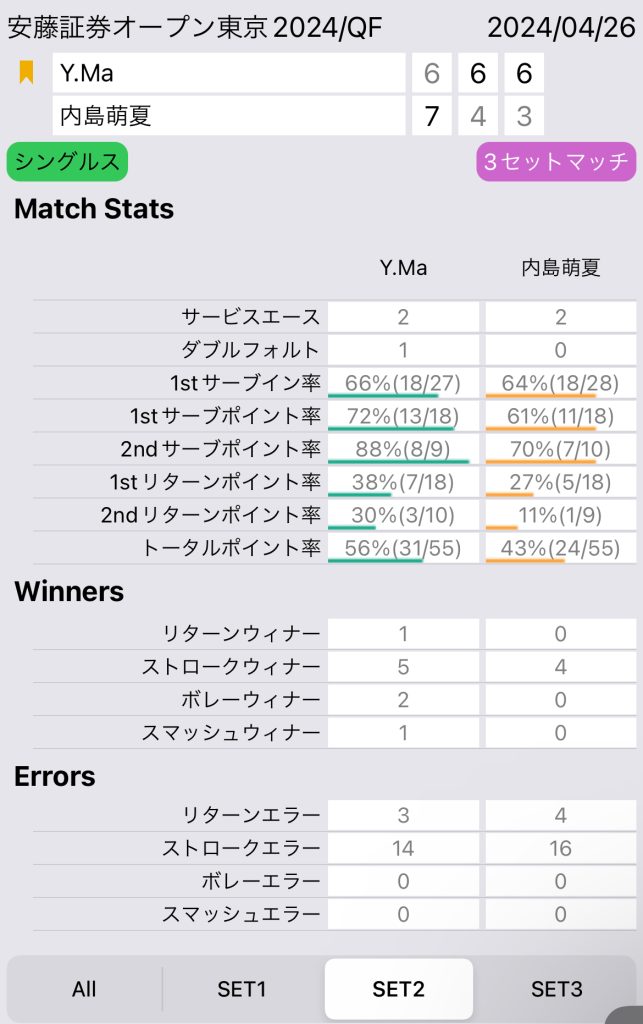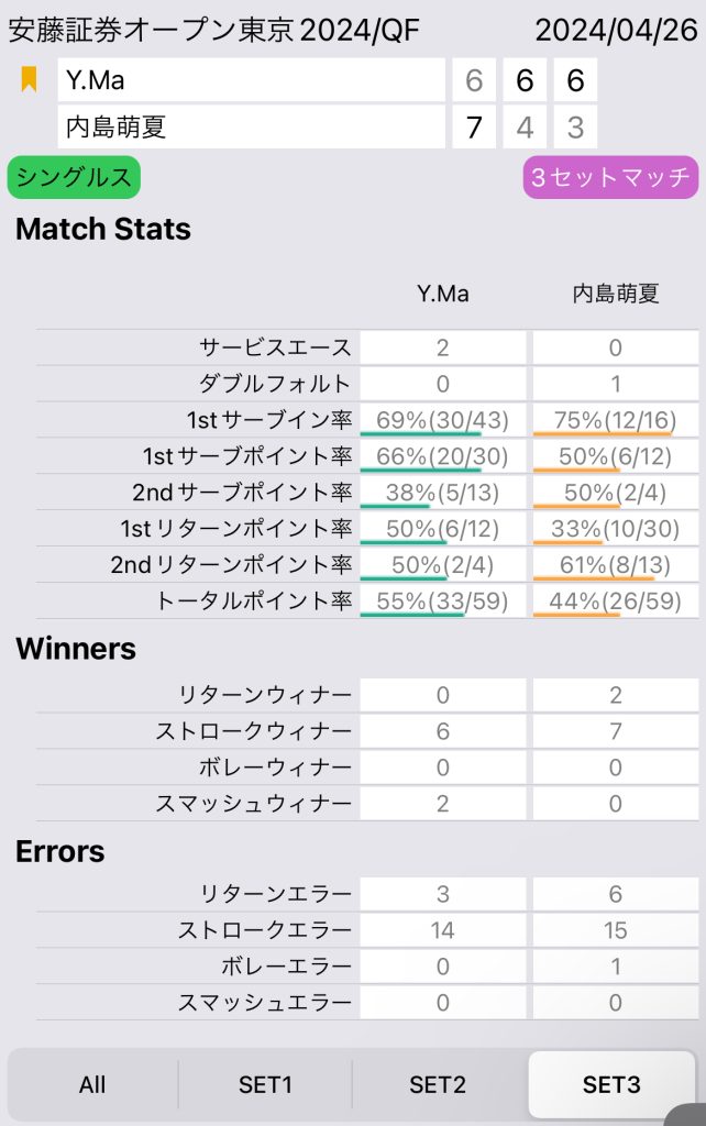 あるとすれば、ネットプレーを積極的にしていたのは、Ma選手でボレーウィナーやスマッシュウィナーが内島選手より多く、展開力に差があると言える。