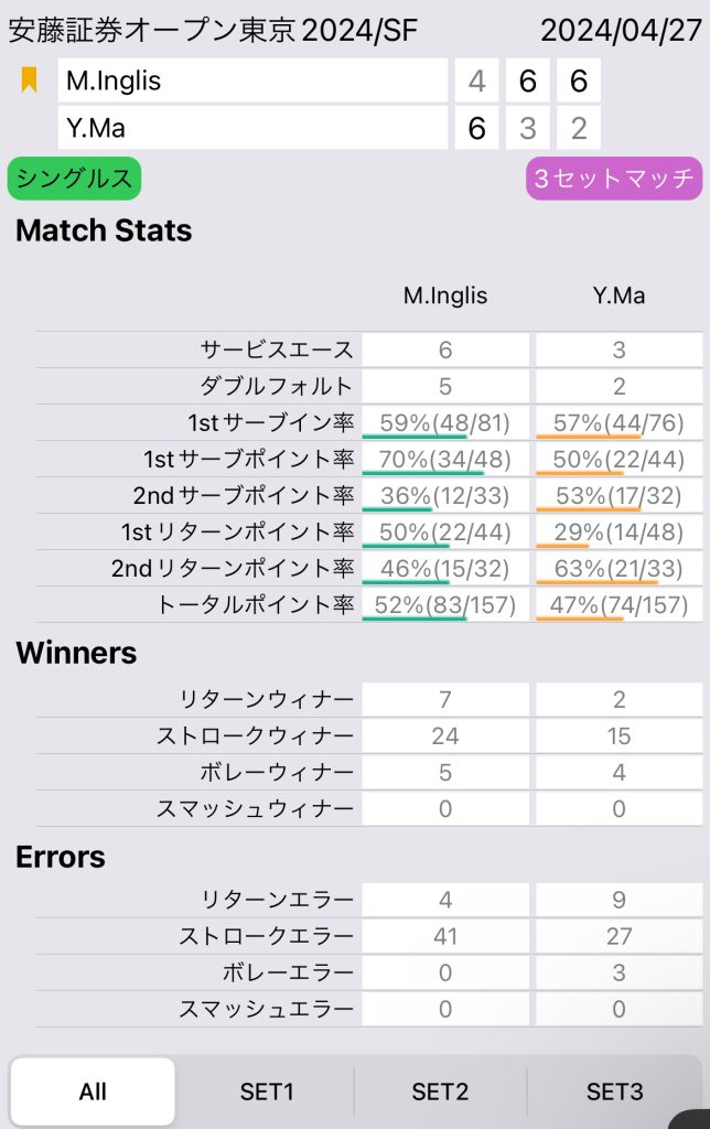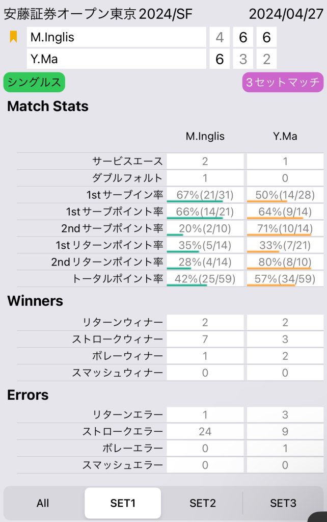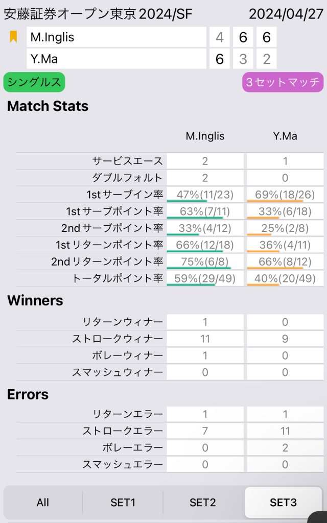 2ndセットはMa選手のファーストサービス確率が50%ほどで低く、セカンドサーブを狙われた形だ。また、クロスラリーがかなり強いMa選手に対して、早い段階でストレートに展開してラリーしてたInglis選手の対応力が見られた試合だった。
