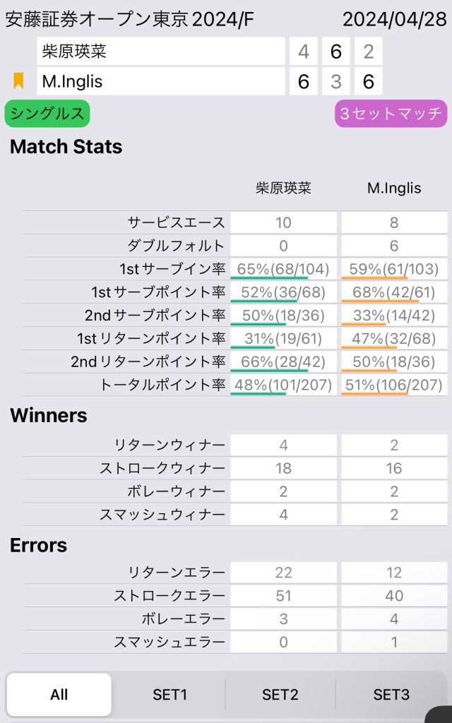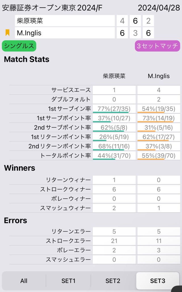 Inglis選手の1stサービスポイント率が68%と柴原選手を上回る。柴原選手のリターンエラー数が22本と今までの試合と比べて非常に多い。それだけInglis選手サービスが良かった。