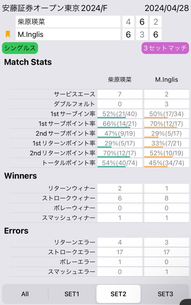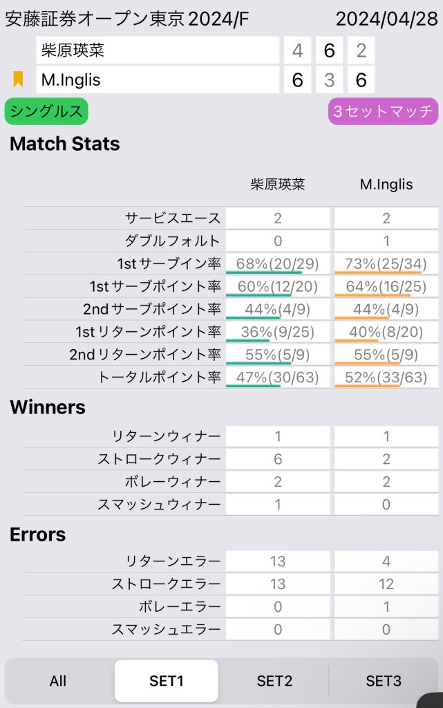 2ndセットは、好調だったInglis選手のファーストサーブが50%まで確率が落ち、それを好材料に柴原選手が2度のブレークに成功し、6-3としてセットタイとした。リターンミスも4本だけ。