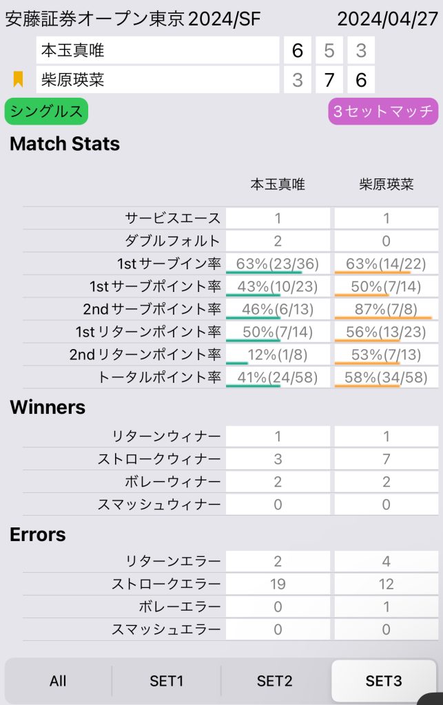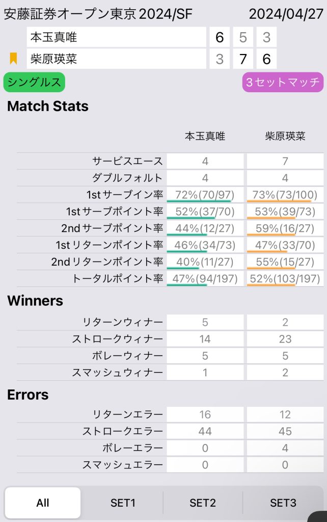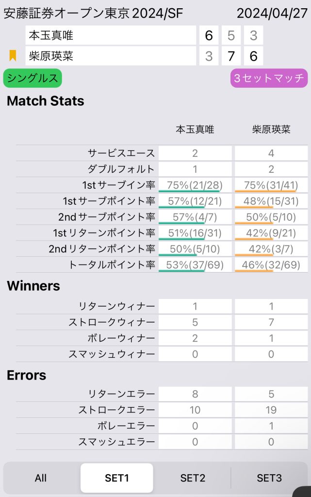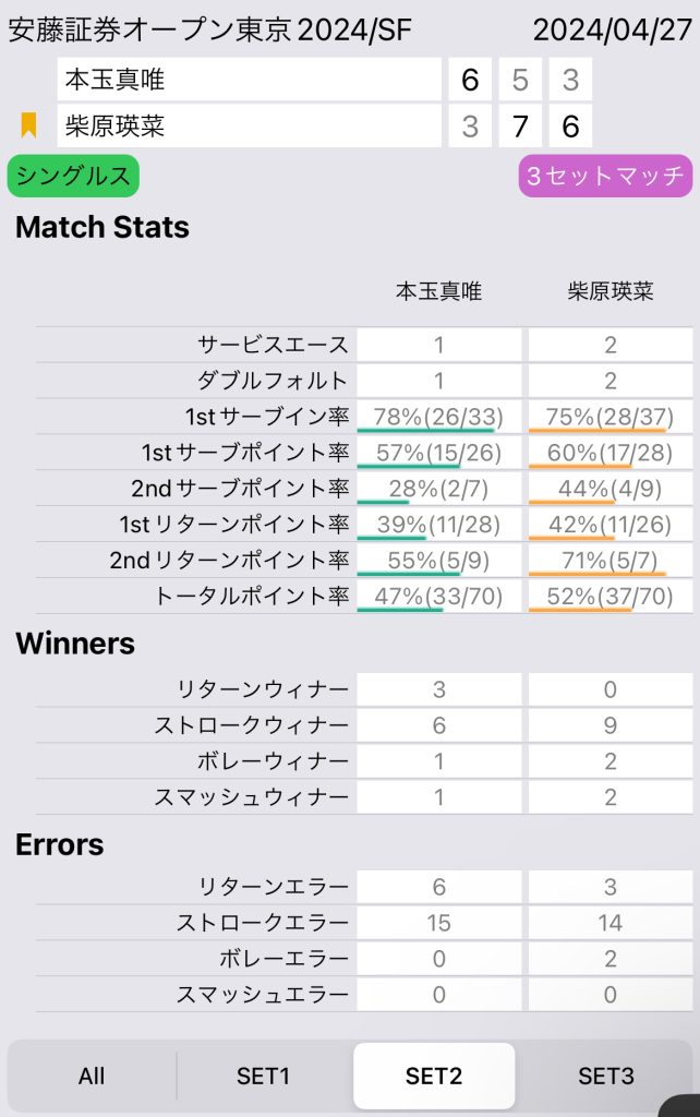 スタッツで目立つ差は、2ndサービスポイント率。柴原選手の方が、2ndサーブが強力である且つリターンから攻めれてる。