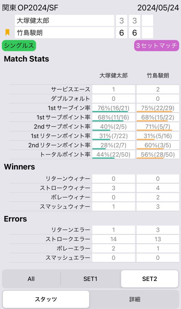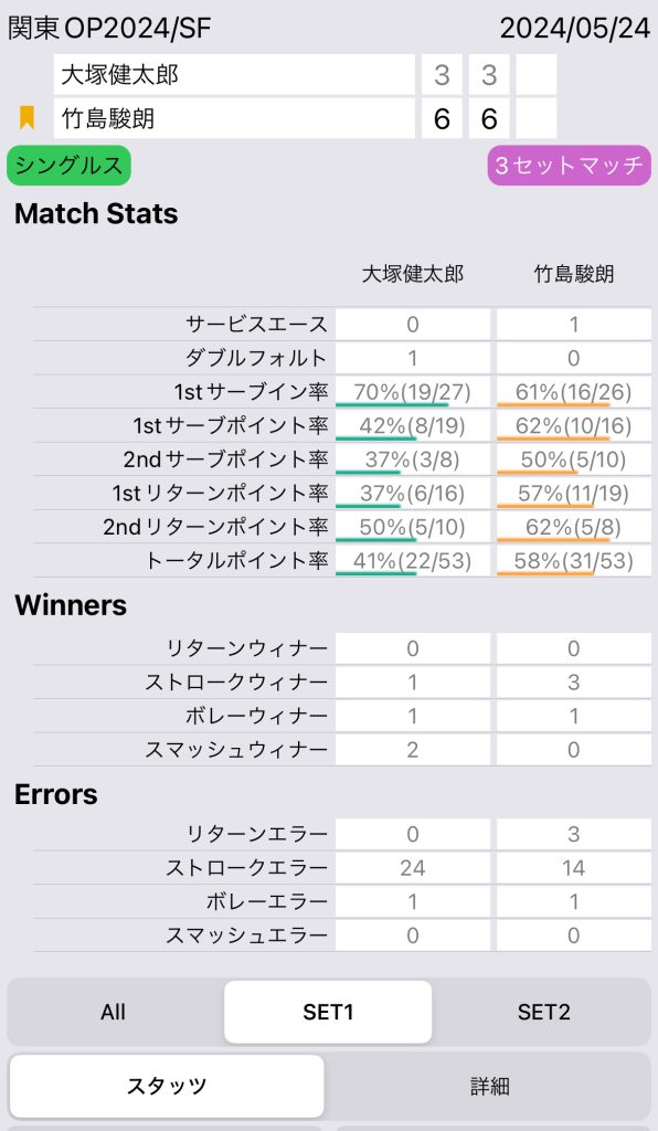 スタッツ面で大きな差が見て取れるのは、ストロークエラー数か。10本以上竹島選手の方が少ない。また、ラリーでは大塚選手が圧倒的に攻めていたが、意外とウィナーも少ないことがわかる。